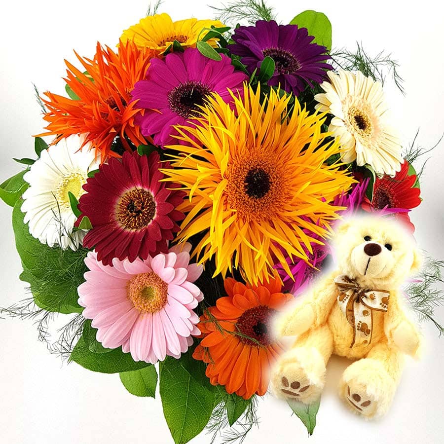 The colorful, cuddly mood booster bouquet is a colorful gerbera bouquet with a teddy bear. It’s a bouquet that spreads joy, puts a smile on your face, and invites you to cuddle.