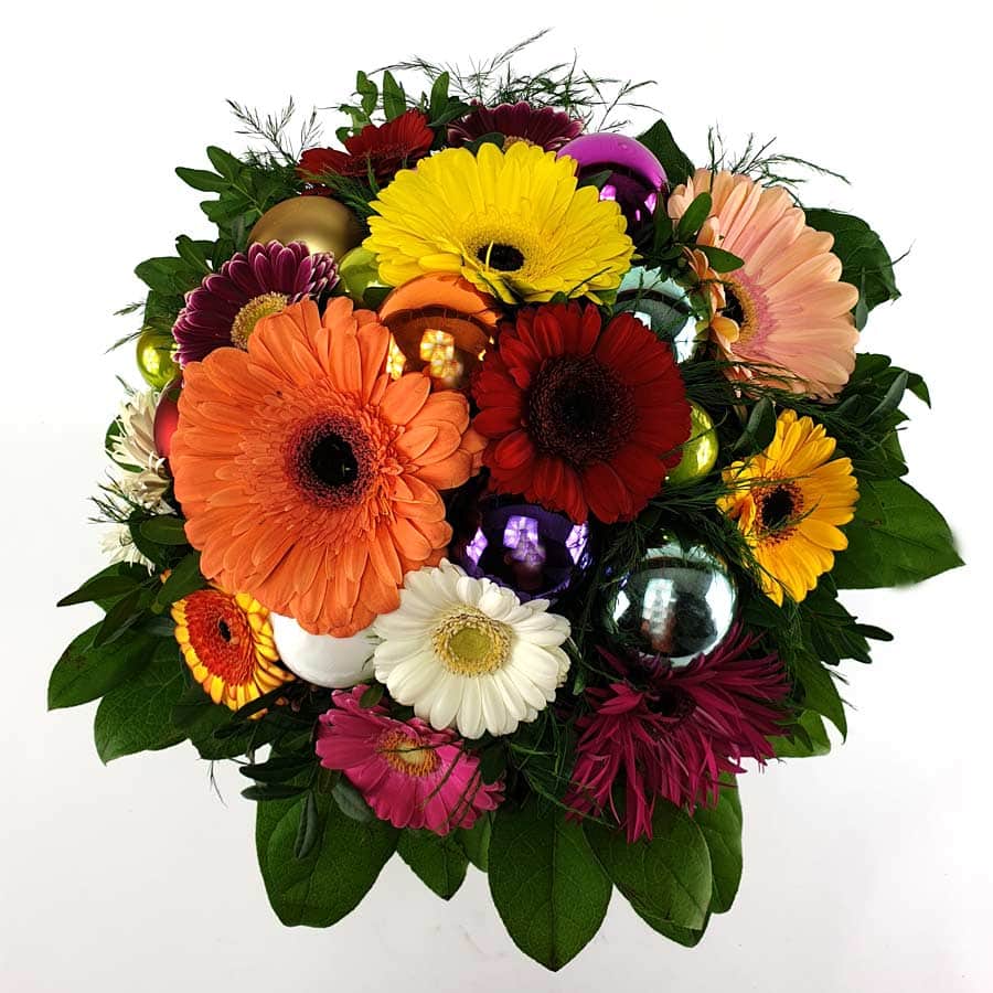 The “Colorful Advent” bouquet is as vibrant as life itself. Gerbera daisies in bright colors compete with colorful glass baubles.
