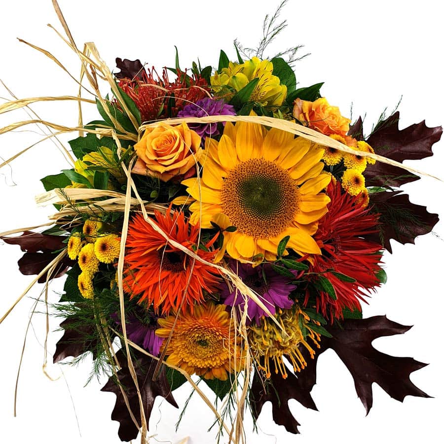 The colorful bouquet of colorful autumn dances is an autumnal color combination. Thus, sunflowers embedded in colorful flowers spread joie de vivre.