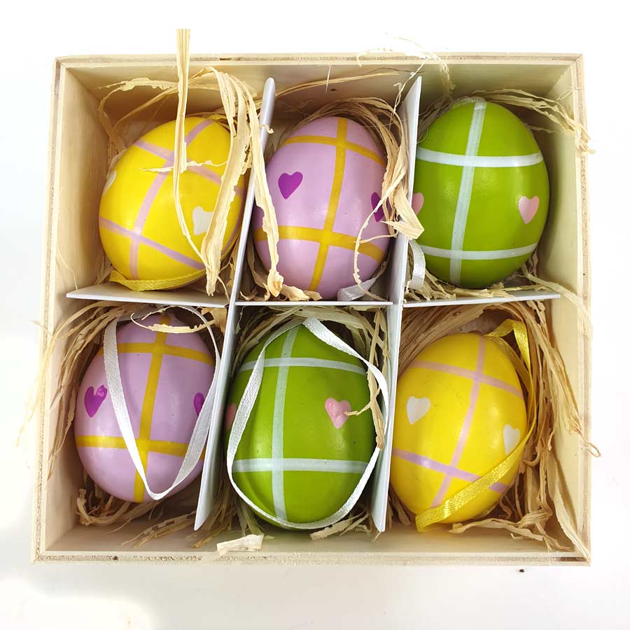 6 assorted colorful chicken eggs with Easter and heartwarming motifs in a wooden box.