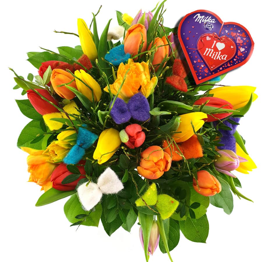 The Colorful Tulip Round Milka Edition bouquet combines colorful tulips and felt loops with blueberry and leaf trim. It also includes an I LOVE MILKA IMPULSE HEART 44g.