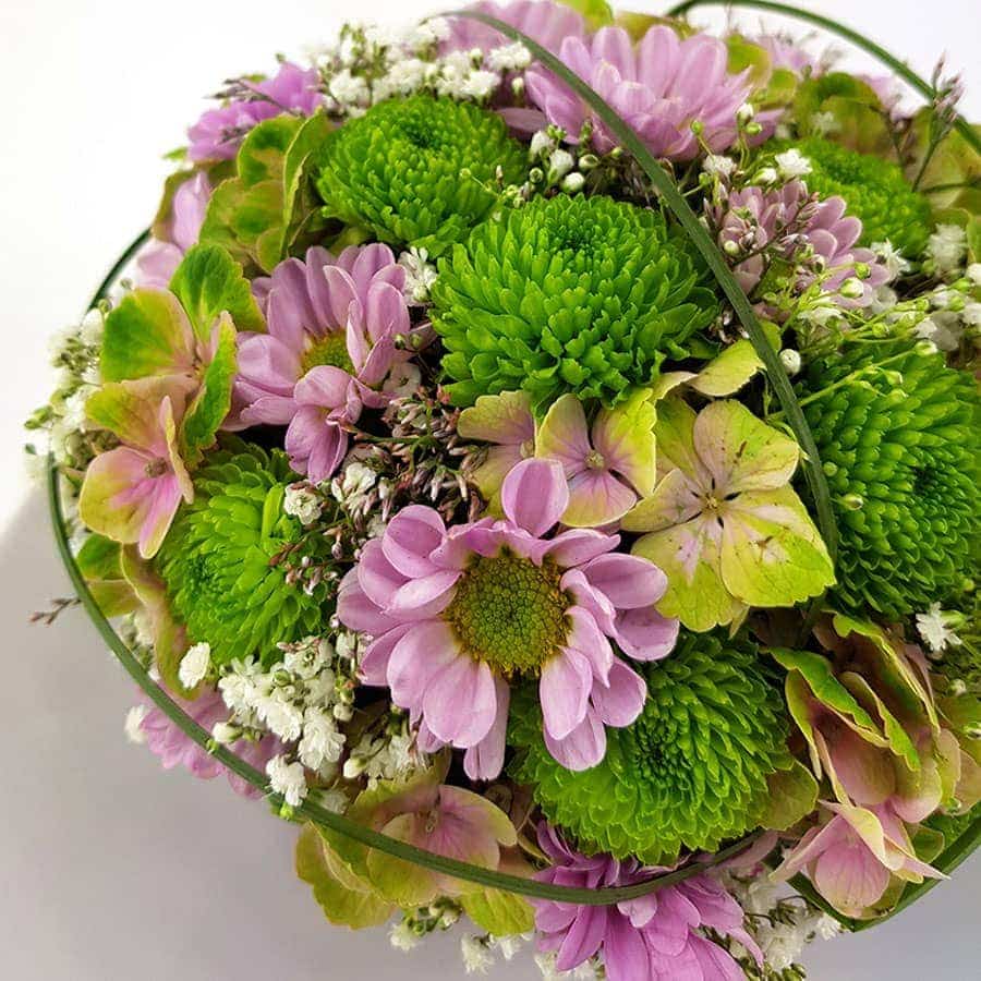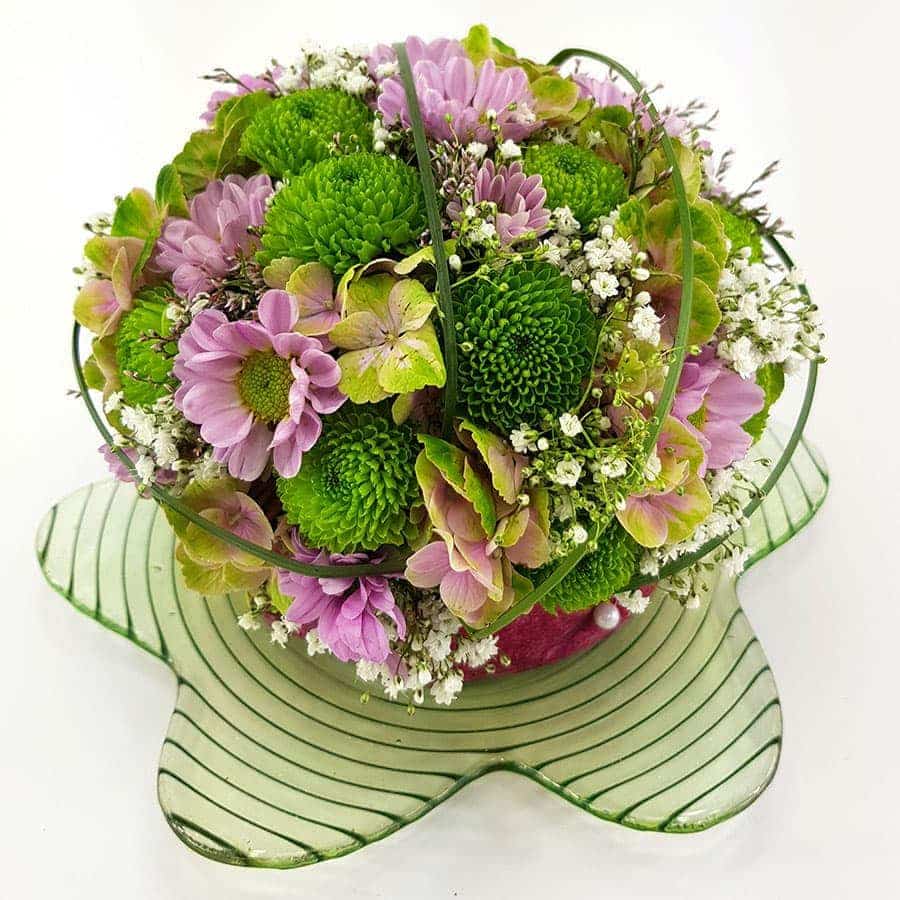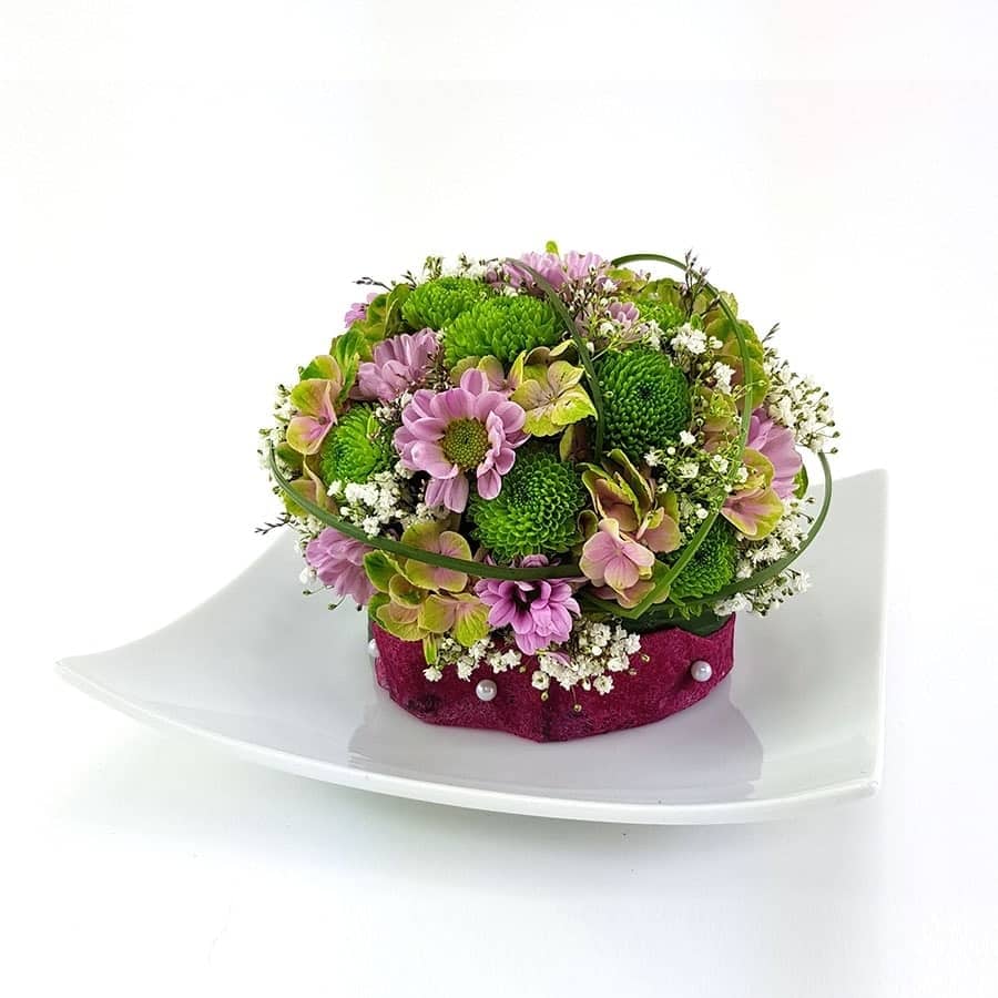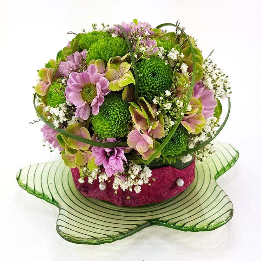 Ein Blumengesteck in Kunststoffschale mit Blatt und Gewebe ummantelt.