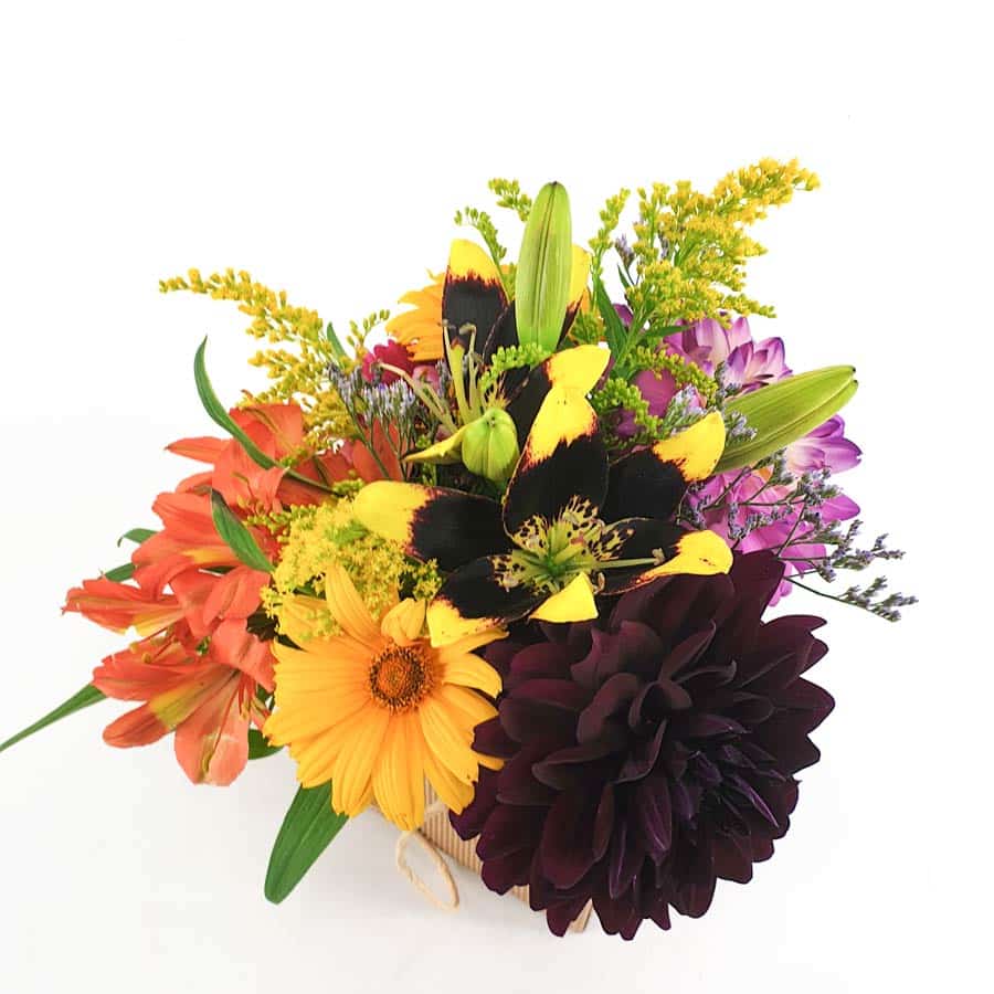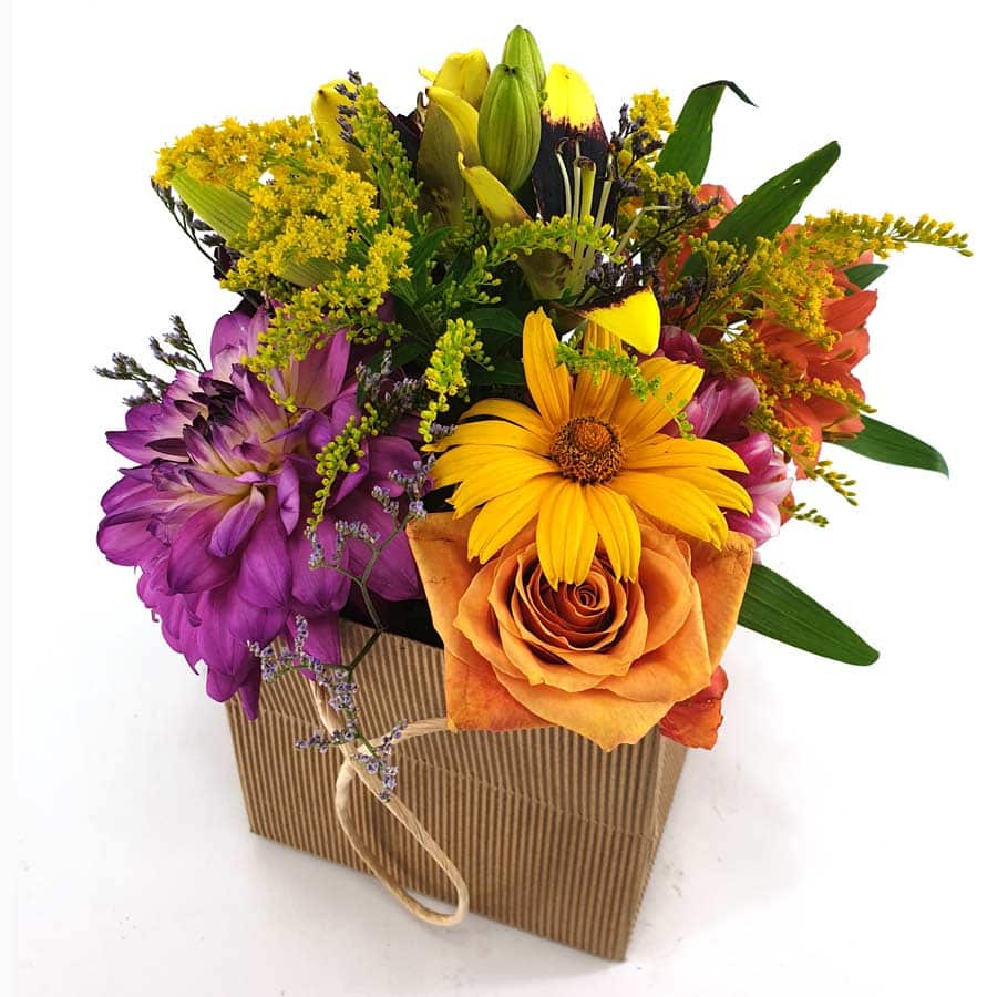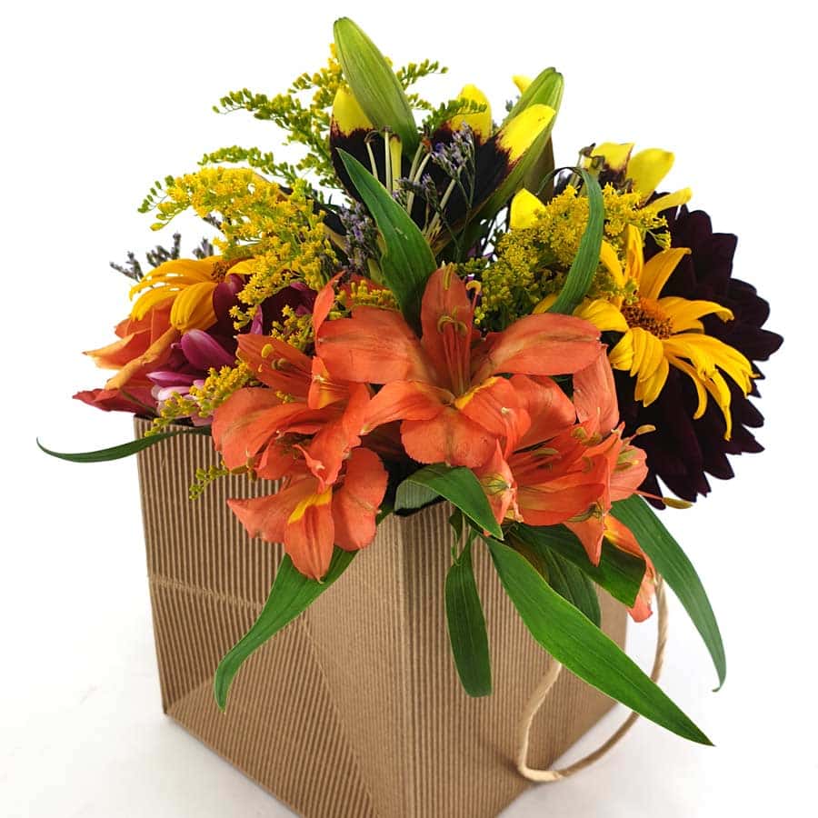Eine formschöne Papiertasche aus Naturpapier gefüllt mit farbenfrohen Blüten der Saison.