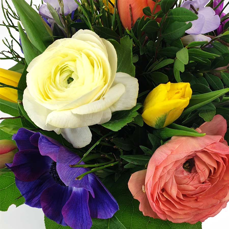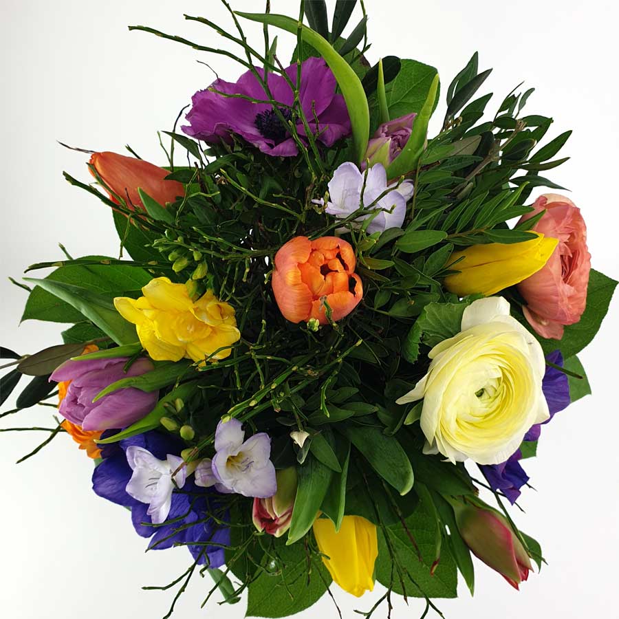 Der Strauß bunter Frühling besticht durch seine farbenfrohe Blütenmischung. Frühlingsblumen mit Grün kombiniert.