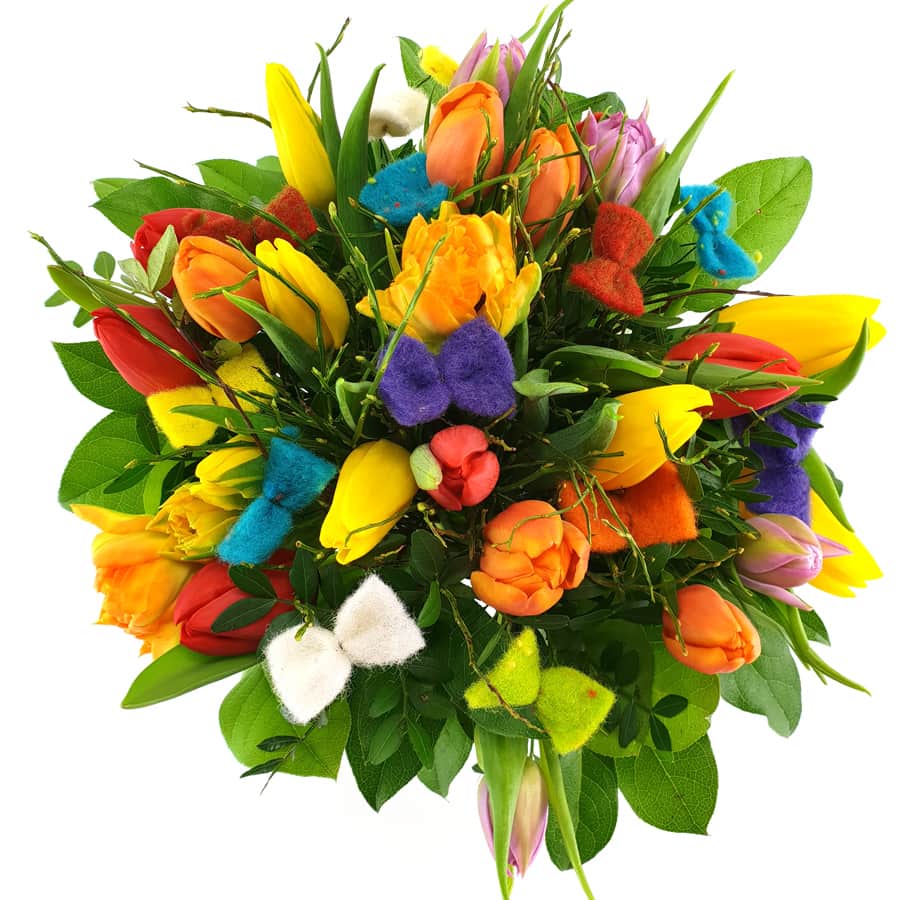 Im Strauß Bunter Tulpen Reigen vereinen sich bunte Tulpen und Filzmaschen mit Heidelbeere und Blattabschluß.