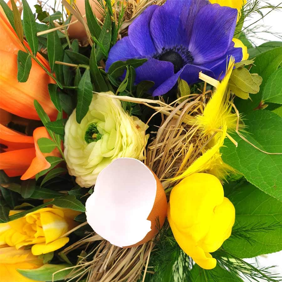 Der Frühlingsstrauß buntes Osternest macht Lust auf Ostern und auf fröhliche, entspannte Feiertage . Dafür binden wir einen Blumenstrauß aus Lilien, Gerbera, Tulpen, Anemonen, Ranunkeln und Fresien bunt gemischt. Darüber hinaus wird er mit Heu, Federn und Eierschalen ausdekoriert.