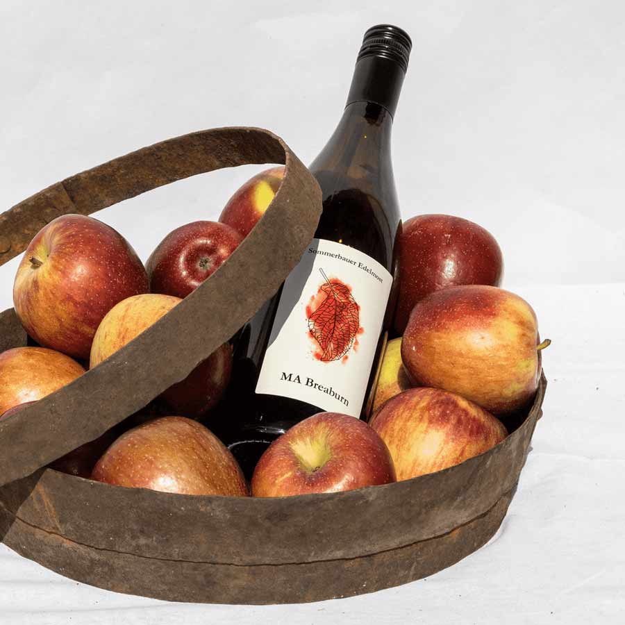 Sortenreiner Braeburn Edelmost.  Nach 18 Stunden Maischestandzeit wurde dieser Edelmost im neutralen Holzfass vergoren und dann für ca. 4 Monate auf der Hefe gelagert.  Direkt aus der steirischen Apfelstraße vom Obstbau Sommerbauer in Puch bei Weiz.