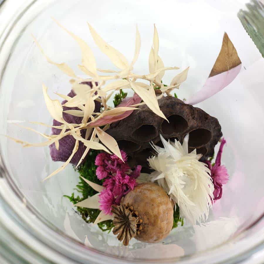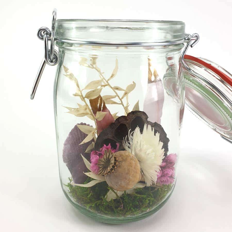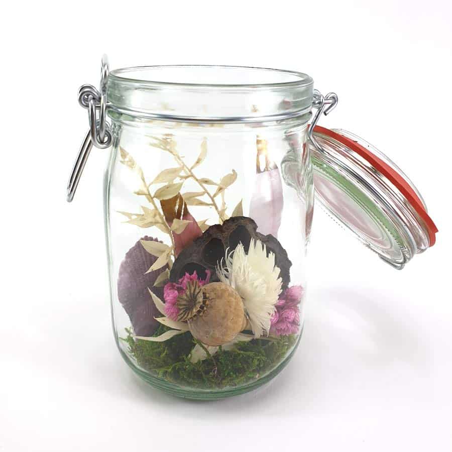 Das Einkochglas Pretty in Pink ist ein Trockenblumenarrangement im besonderen Glas. Somit sind hier Trockenblumen extravagant gestaltet.