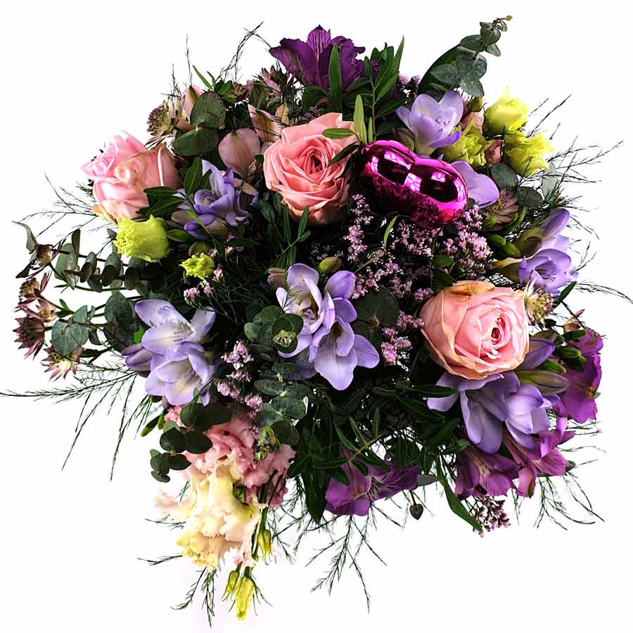 Ein Strauß der durch seine Farbgebung und Natürlichkeit verzaubert. Rosa, lila und pink mit Beiwerk zu einem elfenhaften Strauß gebunden und darüber hinaus mit einem Herz gekrönt.