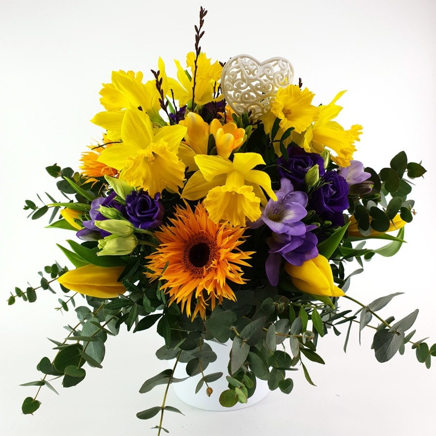 Der Strauß Frühlingstanz in lila und gelb mit Herz besticht durch sein kontrastreiches Farbenspiel mit Herz. Blumenstrauß aus Narzissen, Gerbera, Tulpen und Fresien in lila und gelb mit einem Herz.