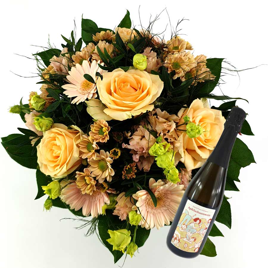 Ein Strauß Ton in Ton im elegantem Farbton creme kombiniert mit einer Flasche Apfelschaumwein. Der Strauß Harmonie in creme Most wanted wirkt elegant und harmonisch. Er besteht aus Rosen, Santini und Gerbera mit weiteren cremfarbenen Blüten mit dezentem Grün und Blattabschluß. Wir krönen diesen Strauß mit einem Apfelschaumwein der Most wanted Kollektion von Konrad Sommerbauer.