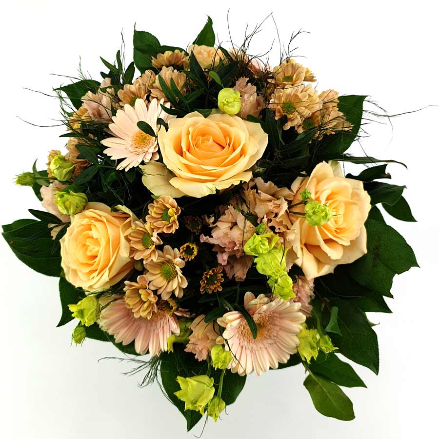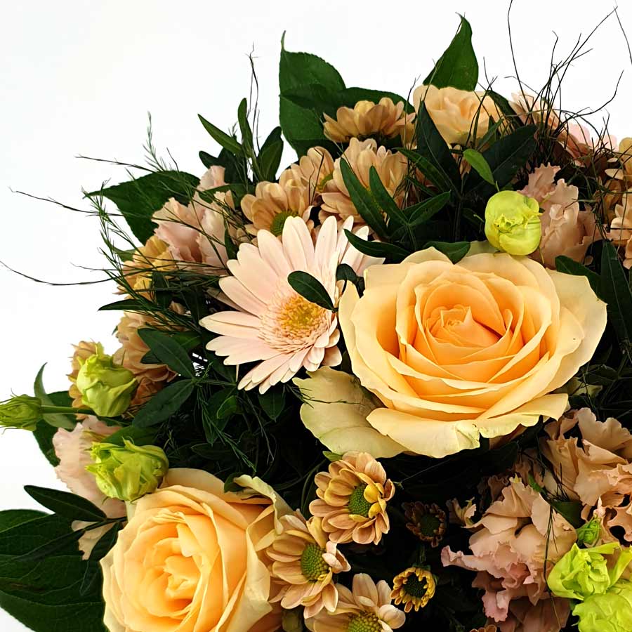 Ein Blumenstrauß Ton in Ton im elegantem Farbton creme. Der Strauß Harmonie in creme wirkt elegant und harmonisch. Er besteht aus Rosen, Santini und Gerbera mit weiteren cremfarbenen Blüten mit dezentem Grün und Blattabschluß.
