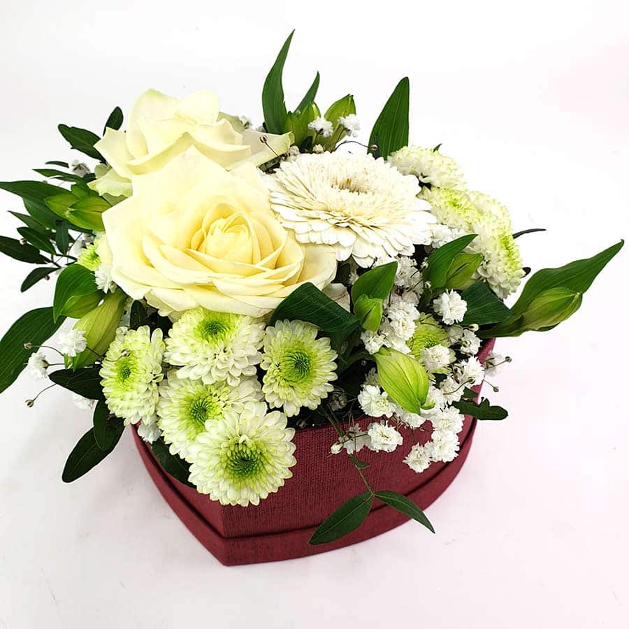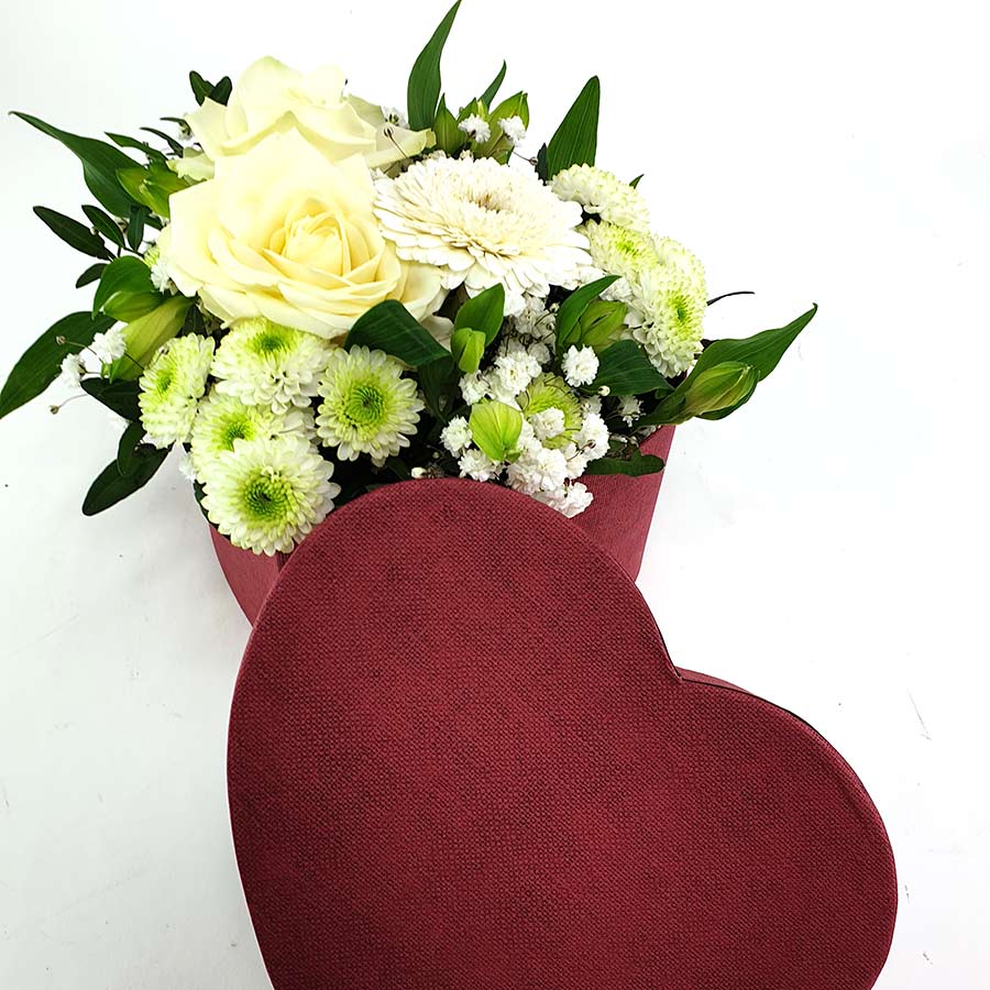 Eine edle rote Hutschachtel in Herzform gefüllt mit einer weißen Rose. mit hellen Blüten dekoriert und mit Schleierkraut und Grün perfektioniert.