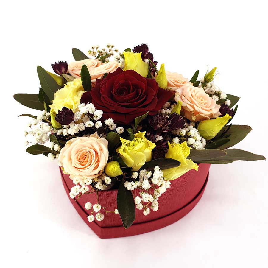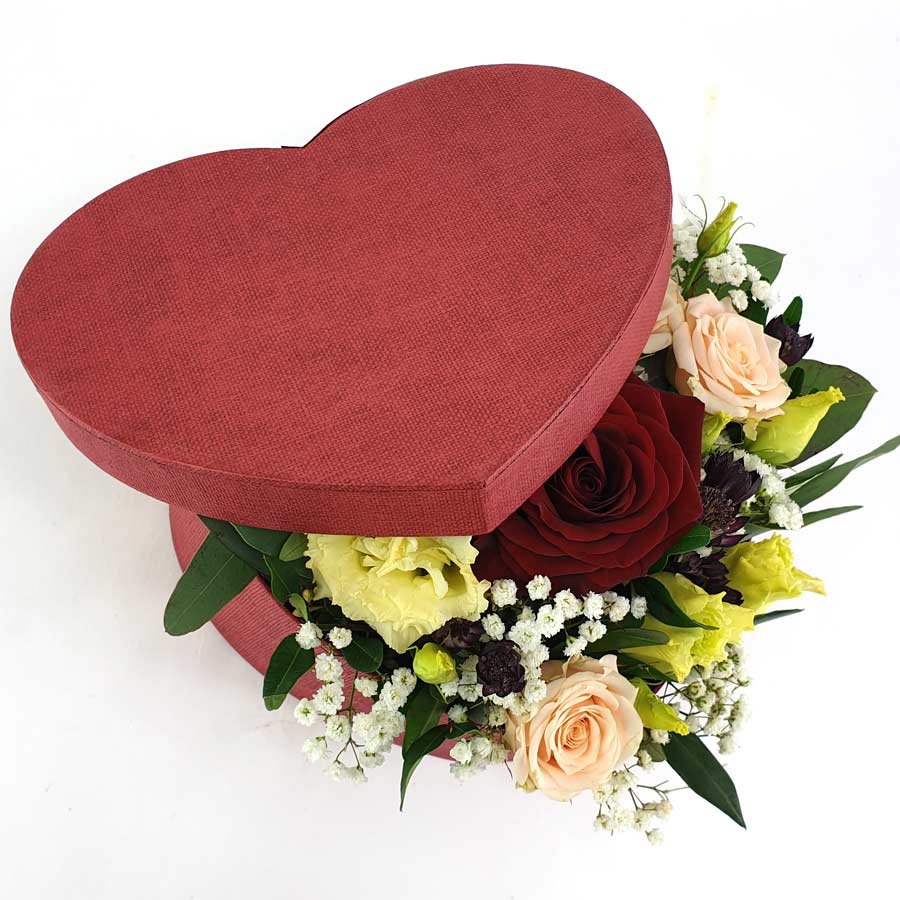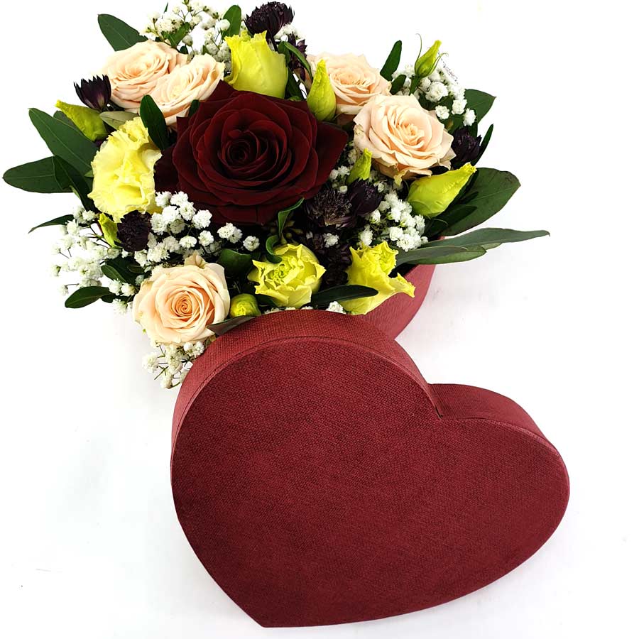 Eine edle rote Hutschachtel in Herzform gefüllt mit einer roten Rose. mit hellen Blüten dekoriert und mit Schleierkraut und Grün perfektioniert.