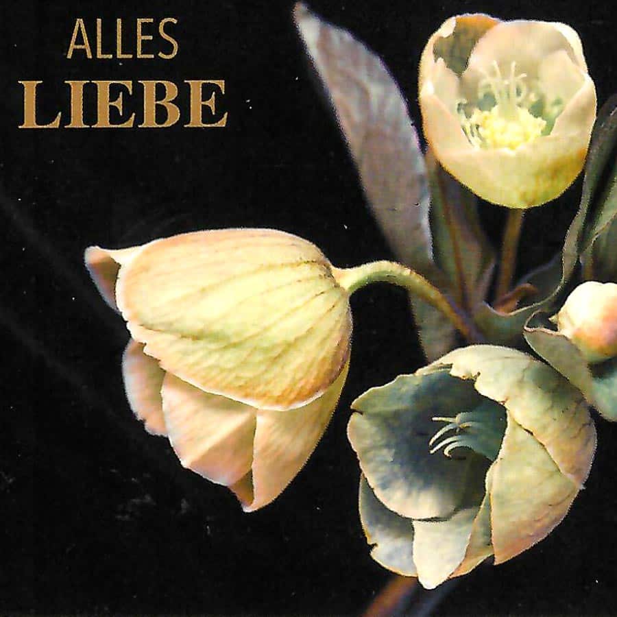 Karte mittel „ALLES LIEBE“ (9×7,5cm). Eine Karte im modernen Design mit Blüten und Alles Liebe. Diese wird mit dem Text Ihrer Wahl und einem Kuvert versehen.