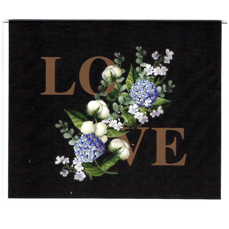 Karte mittel Blumen LOVE (9×7,5cm) mit Blüten und einem goldenen LOVE und dem Text Ihrer Wahl und einem Kuvert.