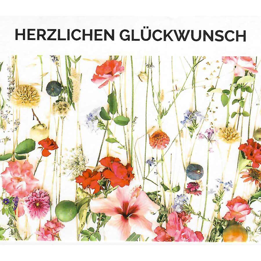 Karte mittel „Herzlichen Glückwunsch“ (9×7,5cm). Eine Karte mit bunten Blumen auf hellem Hintergrund. Diese wird mit dem Text Ihrer Wahl und einem Kuvert versehen.