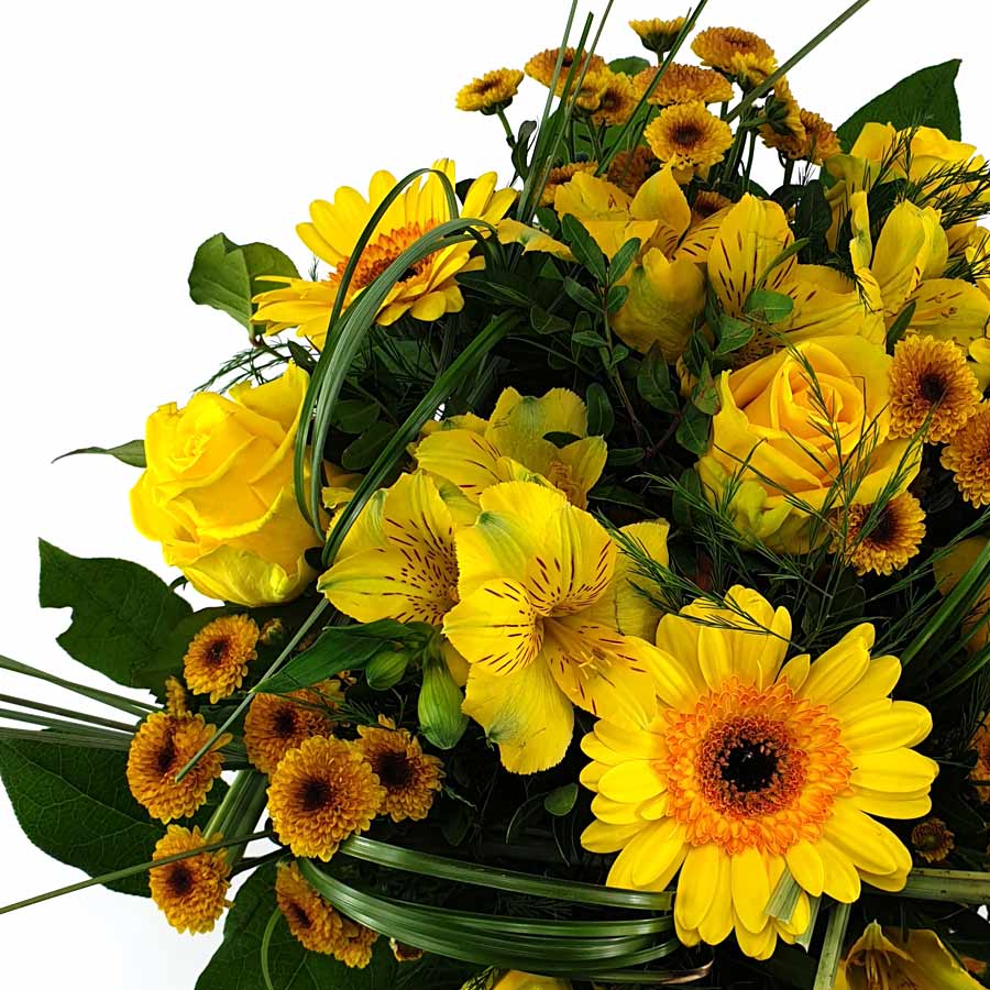 Ein strahlendes Geschenk mit Sonne im Herzen. Der Blumenstrauß Lass die Sonne rein vereinigt verschiedene gelbe Blüten zu einem strahlenden Arrangement.