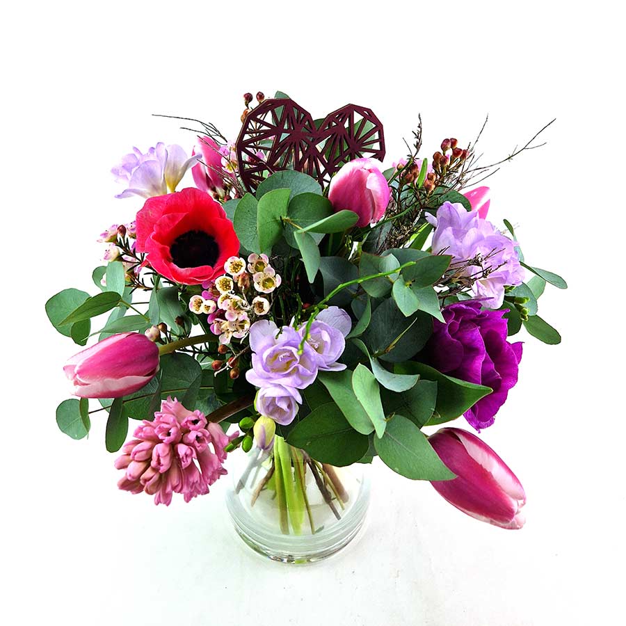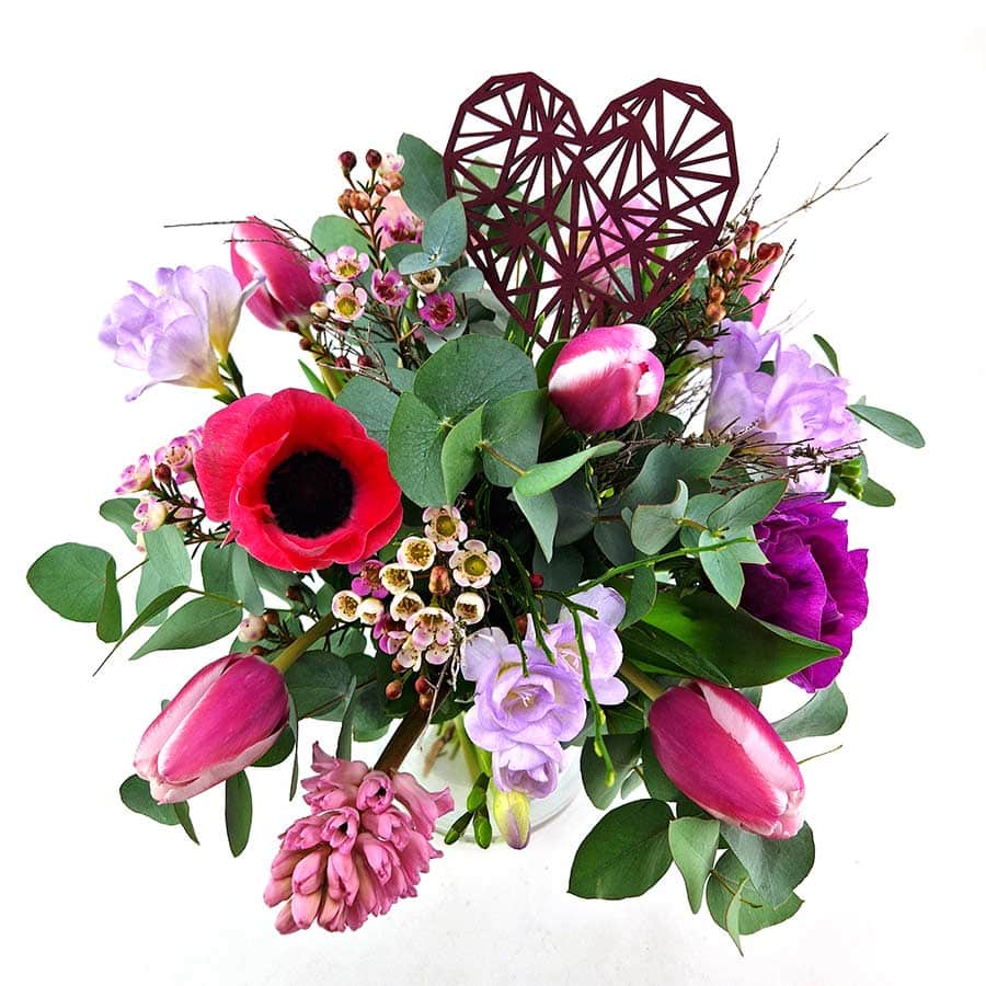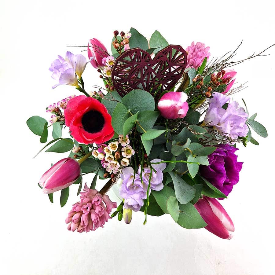 Pink Smile mit Herz ist ein frischer, moderner Blumenstrauß in Pink- und Rosatönen. Zarte Saisonblumen, natürlich gebunden und mit einem dekorativen Herz im Strauß. Sie bringen Farbe, Leichtigkeit und ein echtes Lächeln in jeden Raum.