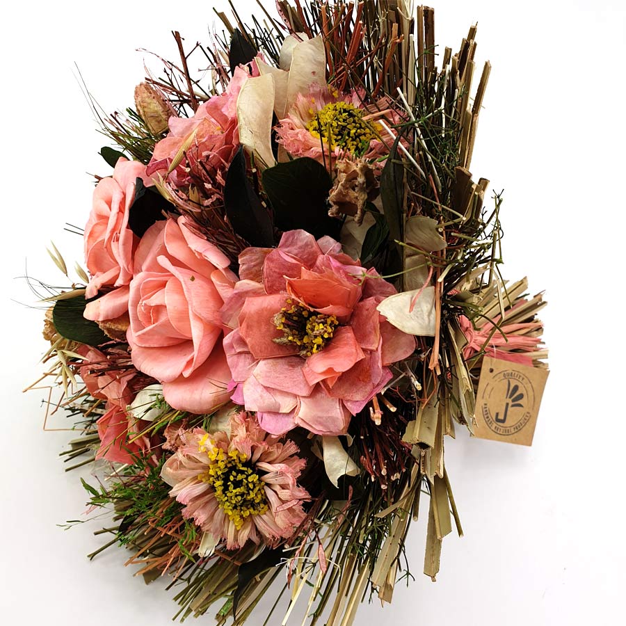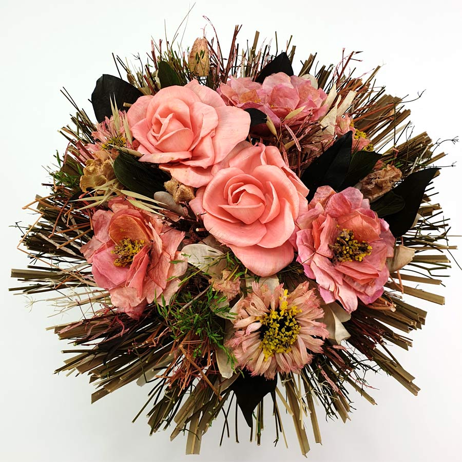 Der Trockenstrauß Holzspanblüten besteht aus Trockenblumen mit Holzspanblüten und Gräsern kombiniert. Darüber hinaus kann der Strauß  frei (ohne Vase) aufgestellt werden.