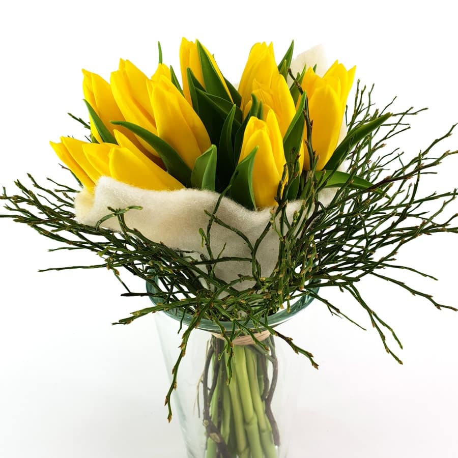 Ein Strauß aus Tulpen im Filzmantel mit Hedelbeere in der sonnigen Farbe gelb. Ein Frühlingsgruß mit dem gewissen Etwas.